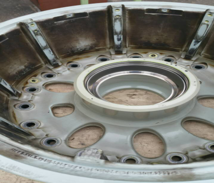 ![]() 需要翻新處理的飛機(jī)輪轂外形尺寸:Φ450-700*H140-400mm (看看,才幾天的飛行,飛機(jī)起降對輪胎、輪轂的沖擊有多大!) 噴砂后接受探傷檢測時的輪轂,讓損傷一覽無余!